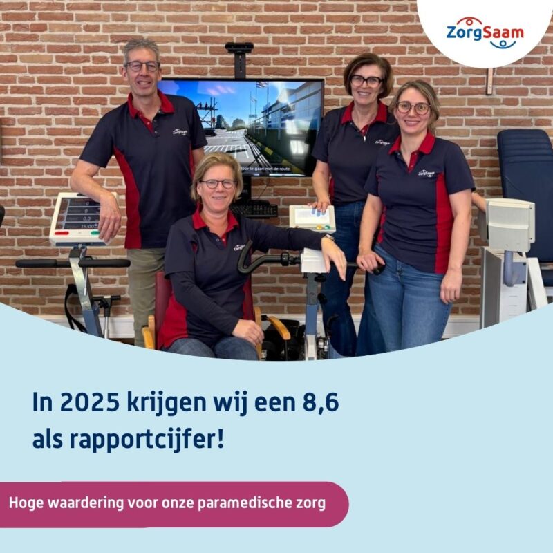 Binnen ZorgSaam krijgen onze paramedische diensten vanuit de Thuis- en Ouderzorg (fysiotherapie, logopedie, ergotherapie en beweegagogie) opnieuw hoge cijfers van cliënten die thuis in de regio zorg ontvangen. Deze resultaten laten zien dat onze begeleiding in de thuissituatie zeer gewaardeerd wordt. In 2025 krijgen wij een 8,6 als rapportcijfer en een 8,7 als aanbevelingsscore!